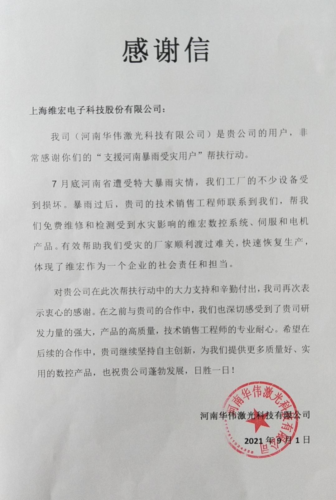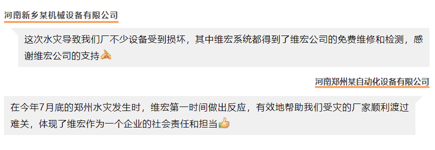 在暴雨之后,维宏股份官方平台发布《暴雨无情,合作有爱 | 维宏股份致河南区域用户的一封信》,专门成立“河南暴雨灾后技术团队”,统计所有河南区域的用户受灾情况,并在灾后免费进行设备和系统的维护。