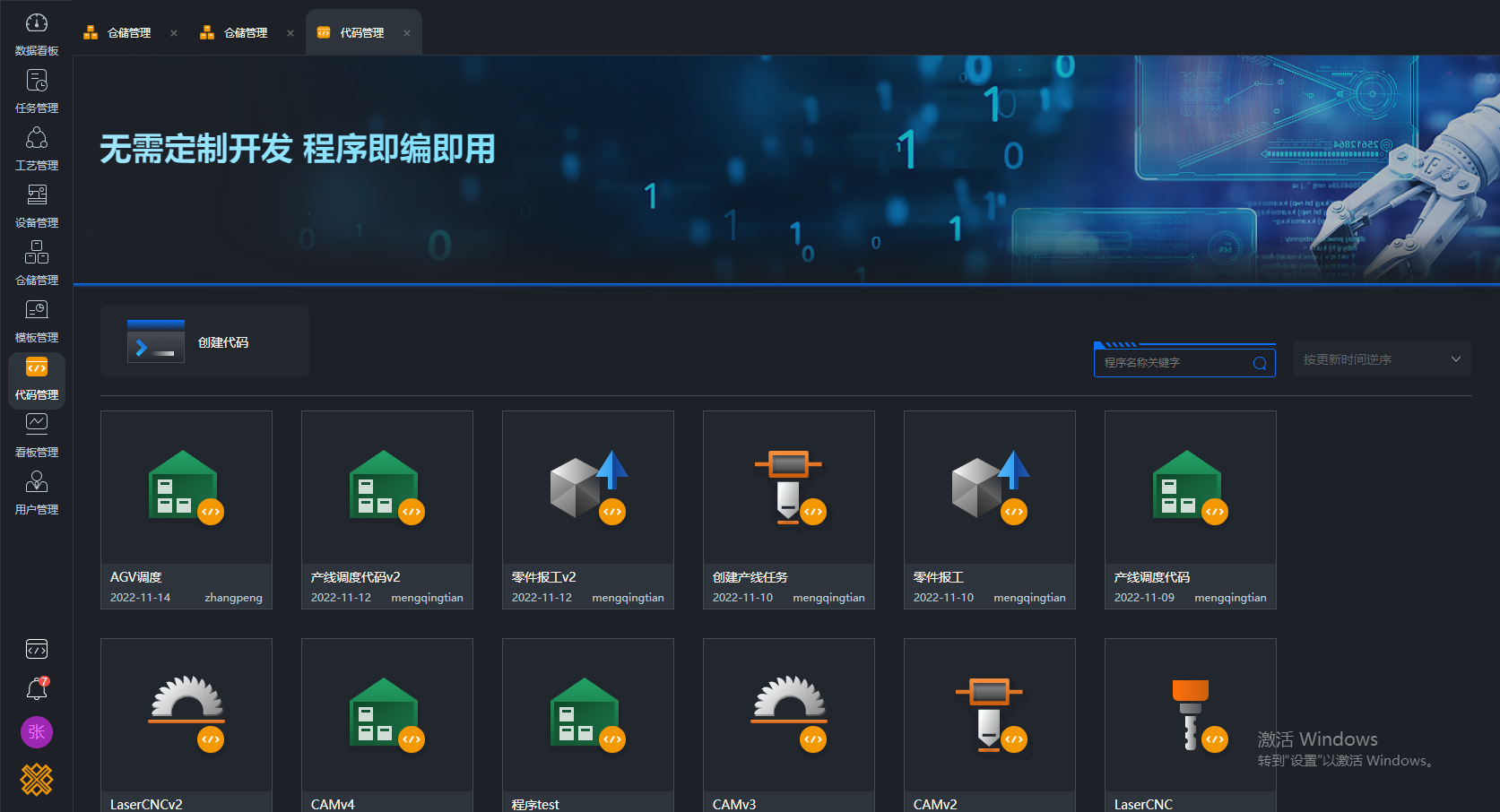 为防止上下料系统出现吸取多层板料问题,设备采用吸盘扳角+磁力分张+气刀吹气+测厚装置的四重保障方案。另外,料库系统配备防坠安全器及电机断电制动功能,预防料库升降机意外坠落。这些特别的控制装置和逻辑,都可以方便地在xFactory-FMS的低代码系统中脚本话设定,或者通过xFactory-FMS及时上报异常情况。
