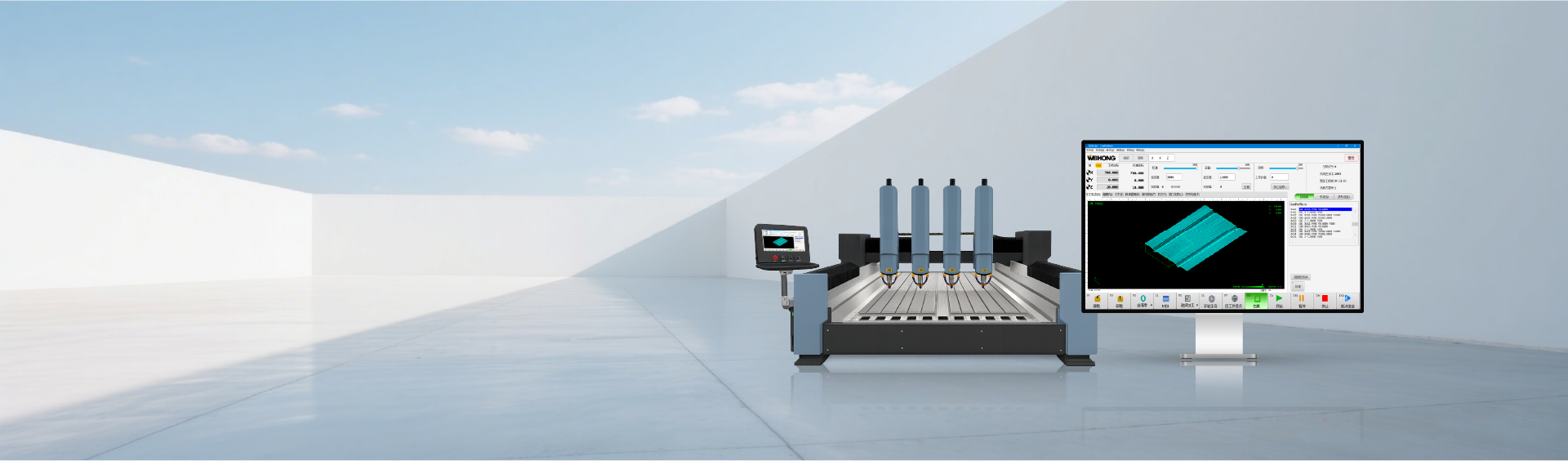 维宏木工/石材雕刻系统支持五轴RTCP加工,支持高精度轮廓平滑功能,可有效平滑前刀尖轨迹、平滑后轮廓轨迹,提升表面质量;支持斜平面加工,可以在空间上的任意平面上定义一个新的三维坐标系,并在此坐标系上指定加工程序进行加工;支持高精度位姿控制,系统会针对刀尖点轨迹与刀具矢量变化同时进行平滑,使得刀尖点轨迹连续情况下,旋转轴与直线轴运动协调。